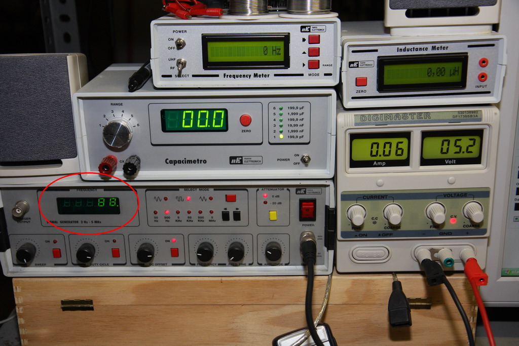 In allegato la foto delle radiosorgenti utilizzate e di HADARP, quest’ultimo nel mio laboratorio durante il test elettronico. Notare la frequenza generata dal GBF di 88 Hz (pari a 88 colpi al secondo) e il valore rilevato da HADARP stesso, inviato al PC tramite RS232.